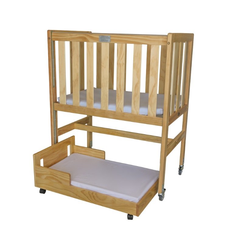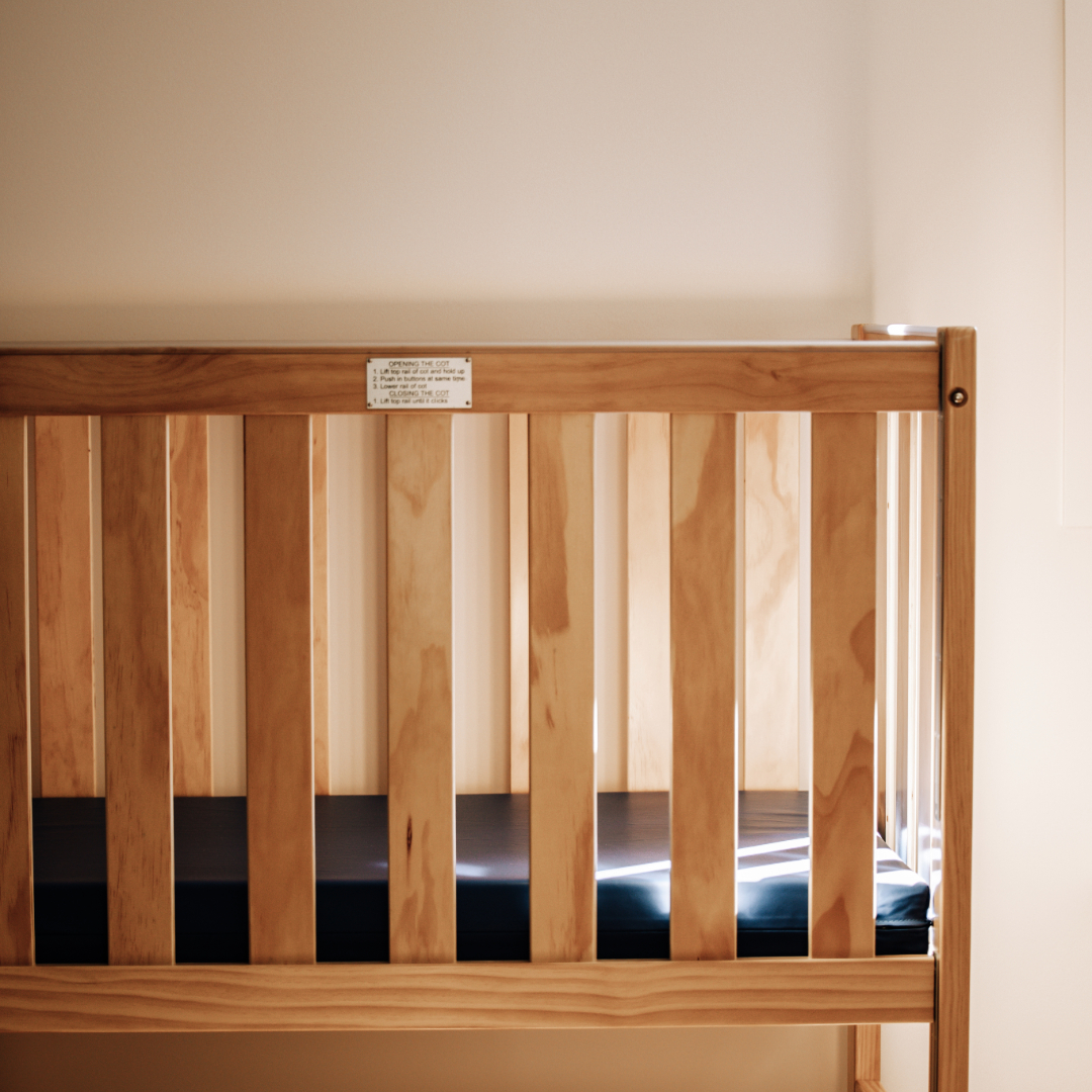 A compact size, sturdy, natural timber cot, with waterproof mattress and 2 base heights.