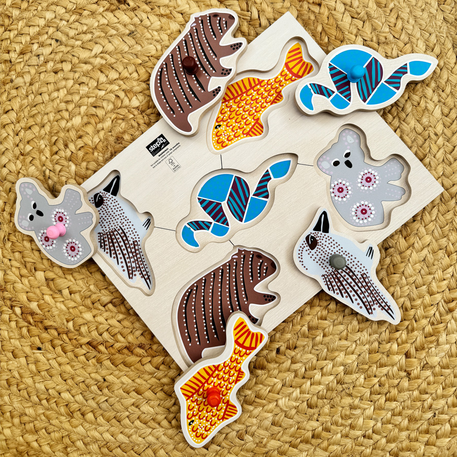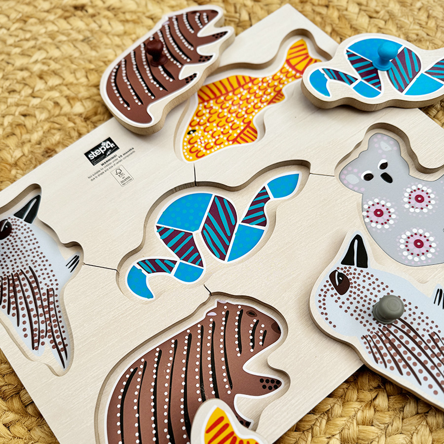 Introduce children to Australia’s unique wildlife and rich First Nations culture with this beautifully crafted Aboriginal Art Native Animals Peg Puzzle. Featuring authentic artwork and easy-grip wooden pegs, this puzzle helps develop fine motor skills, matching, and early problem-solving while offering meaningful opportunities for cultural connection.