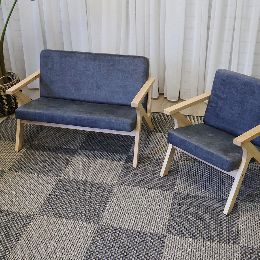 The solid timber frame features angled legs and supportive armrests, paired with a soft upholstered seat and backrest in a dark storm fabric. Ideal for reading corners, quiet spaces or collaborative areas, the Luna Single Sofa adds both function and refined style to the environment.