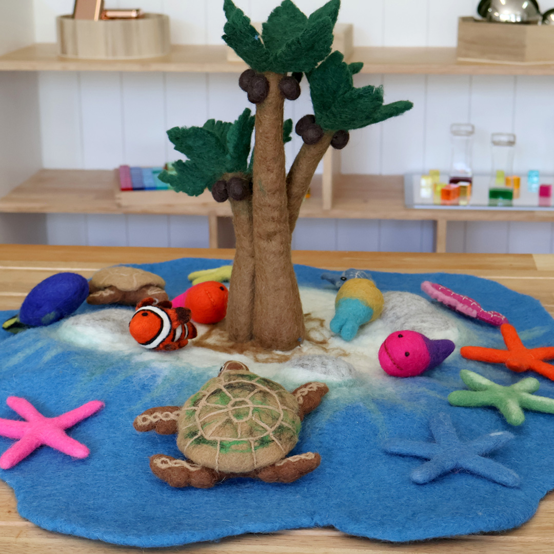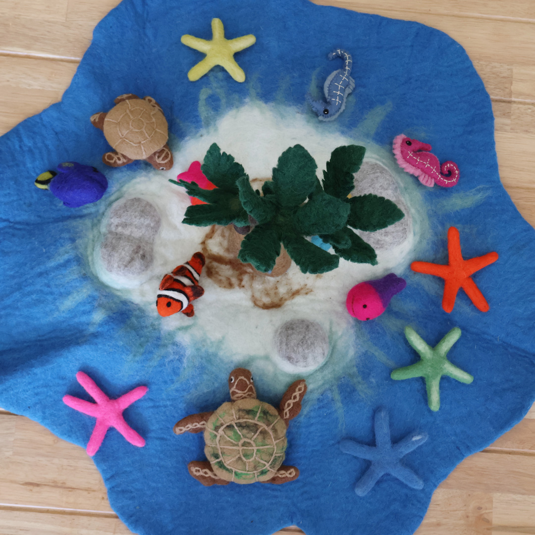 Set includes: large felt island play mat, tall felt tree, and assorted sea creatures