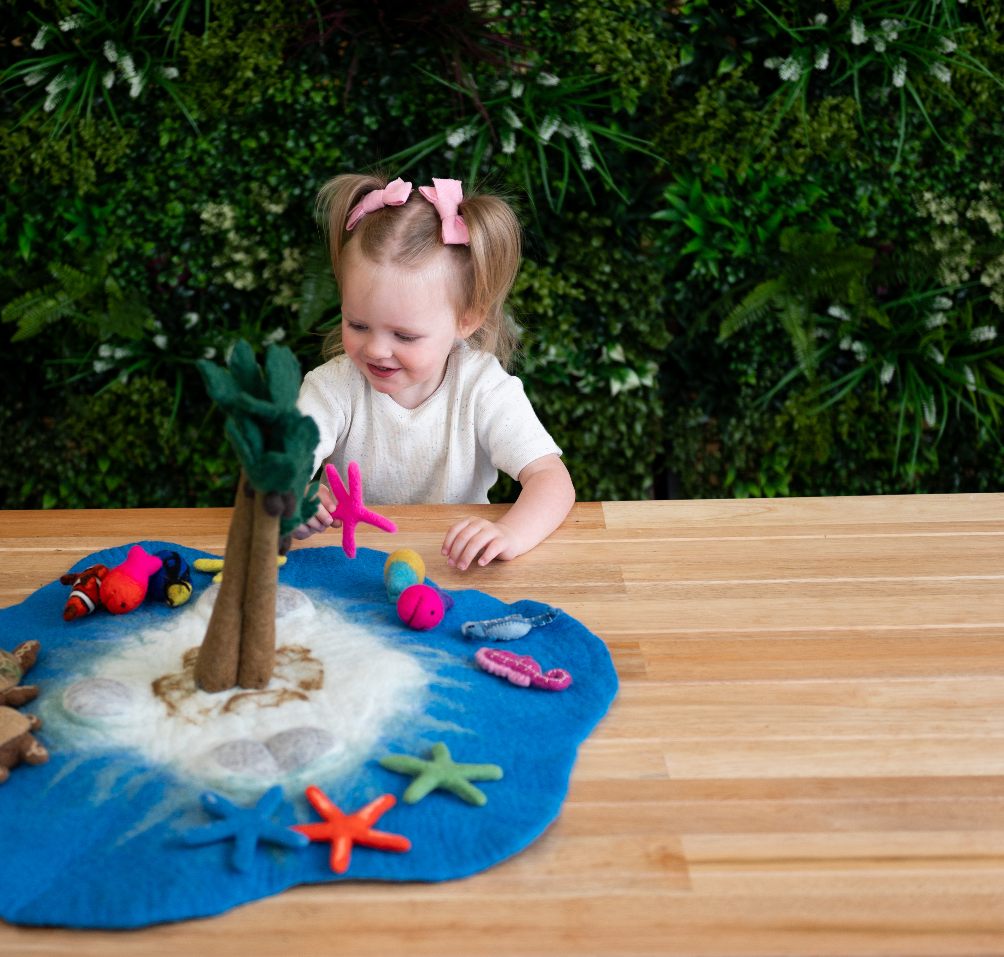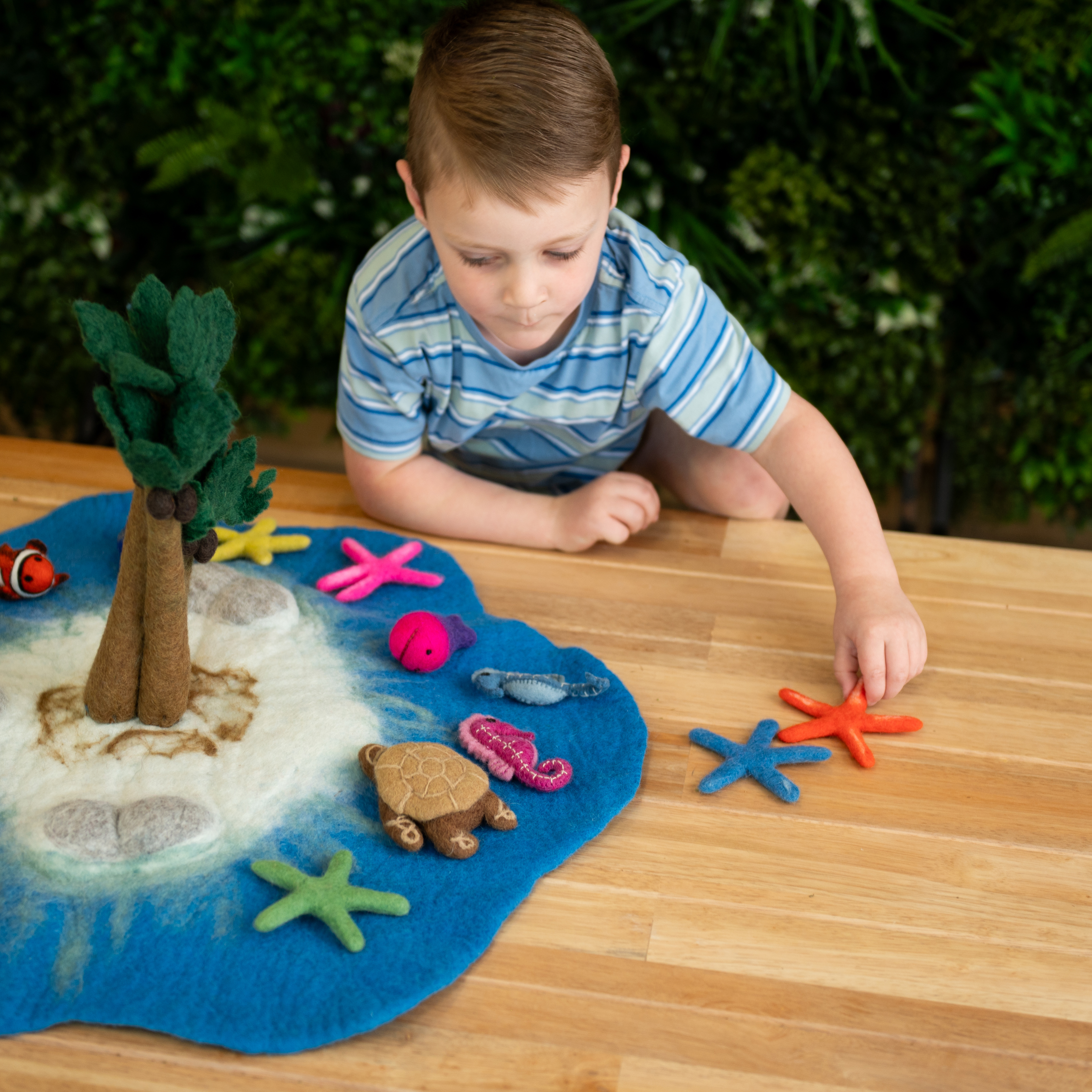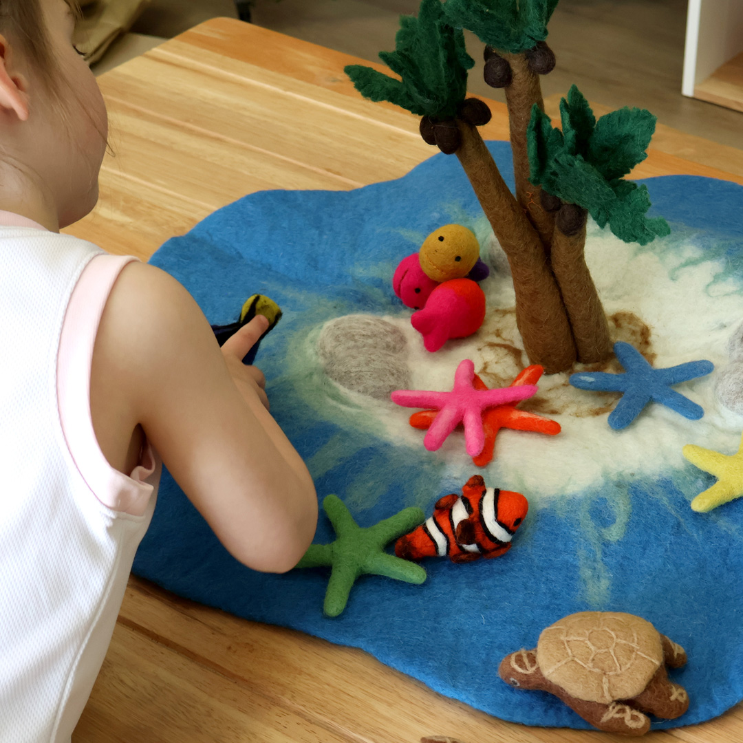 Encourage open-ended play and spark children's imaginations with our beautifully handcrafted Felt Island Escape Play Mat & Accessories set. This tropical-themed play mat offers a rich small world setting, complete with island scenery, lush textures, and charming characters to inspire storytelling and sensory exploration. Whether it's a desert island adventure or a quiet beach hideaway, this set invites children to immerse themselves in imaginative, nature-based play. Made from eco-friendly, non-toxic materials, the soft felt textures are gentle on little hands and perfect for. Children can develop their creativity, language, and social skills while engaging in collaborative or independent play in floor-based or tabletop setups.