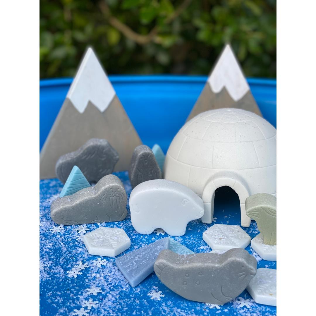 Set includes: 8 polar animal figures, 18 scenery stones, and 1 play igloo