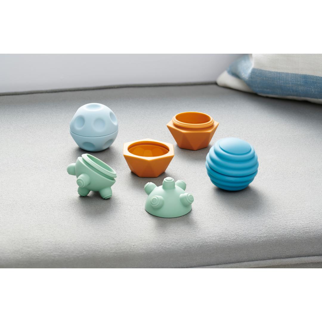 Set of 4 neutral-toned sensory balls with a variety of textures and a twist-to-open design