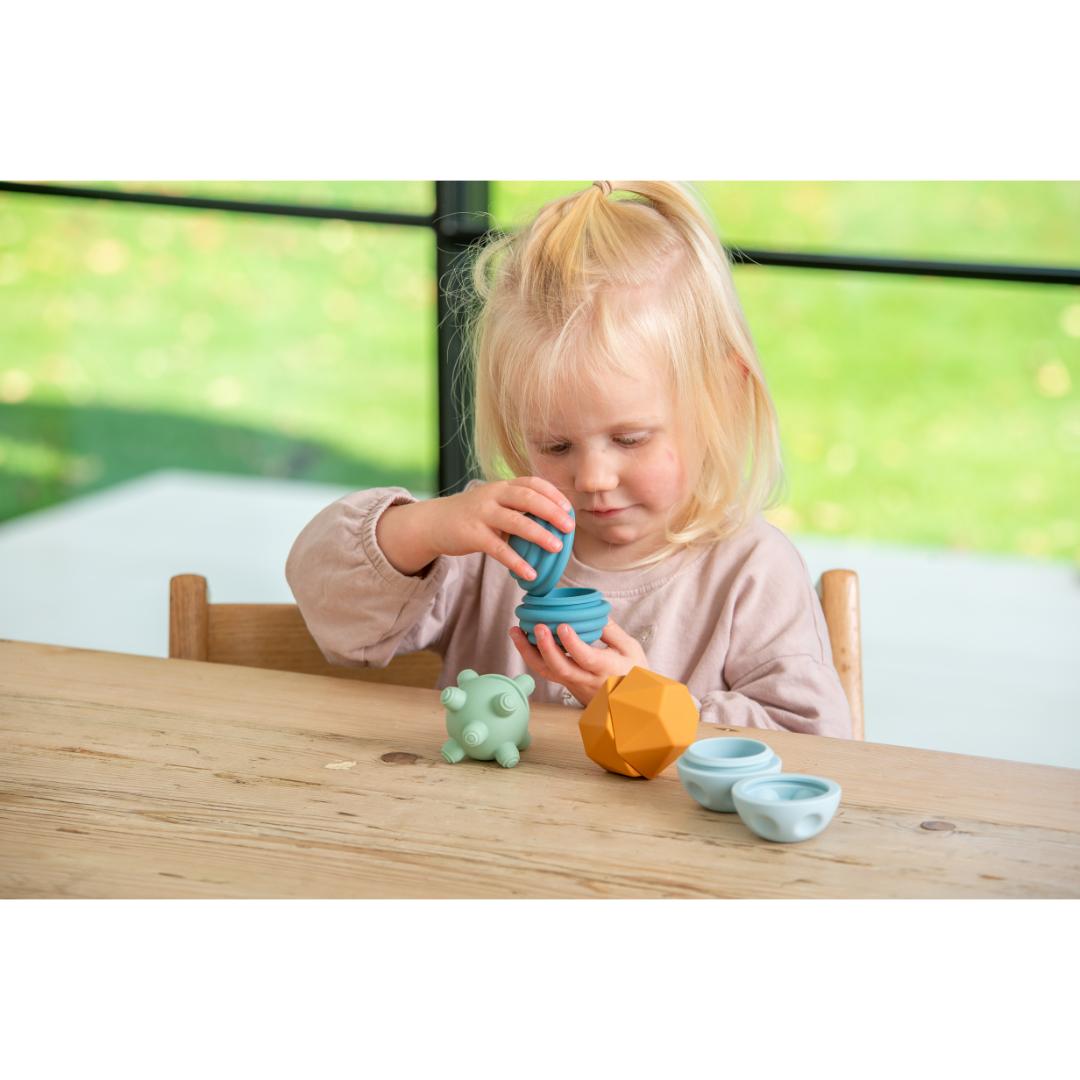 Soft, soothing, and thoughtfully designed, the Silicone Sensory Balls – Neutral offer a calming sensory experience through touch, sound, and movement. Each ball features a unique combination of textures, ridges, patterns, and bobbles that encourage tactile exploration and support fine motor development. The twist-to-open design allows children to fill the balls with beads or other materials to create personalised sensory shakers – perfect for hands-on discovery and sensory stimulation. Ideal for individual or group play, these versatile balls also support early grasping and coordination skills.
