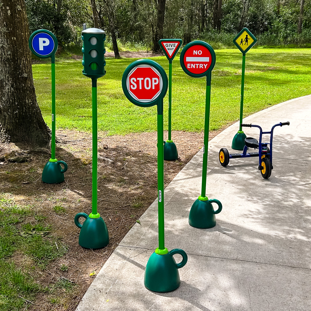 Introduce road awareness and safe riding habits through engaging outdoor play with this set of 6 Road Safety Signs. Designed for bike tracks and dramatic play spaces, these bright, realistic signs help children recognise common traffic symbols while building key skills such as cooperation, turn-taking, problem-solving, and making safe decisions. Lightweight for easy setup yet sturdy once positioned, the bases can be filled with sand or water for extra stability during active play.